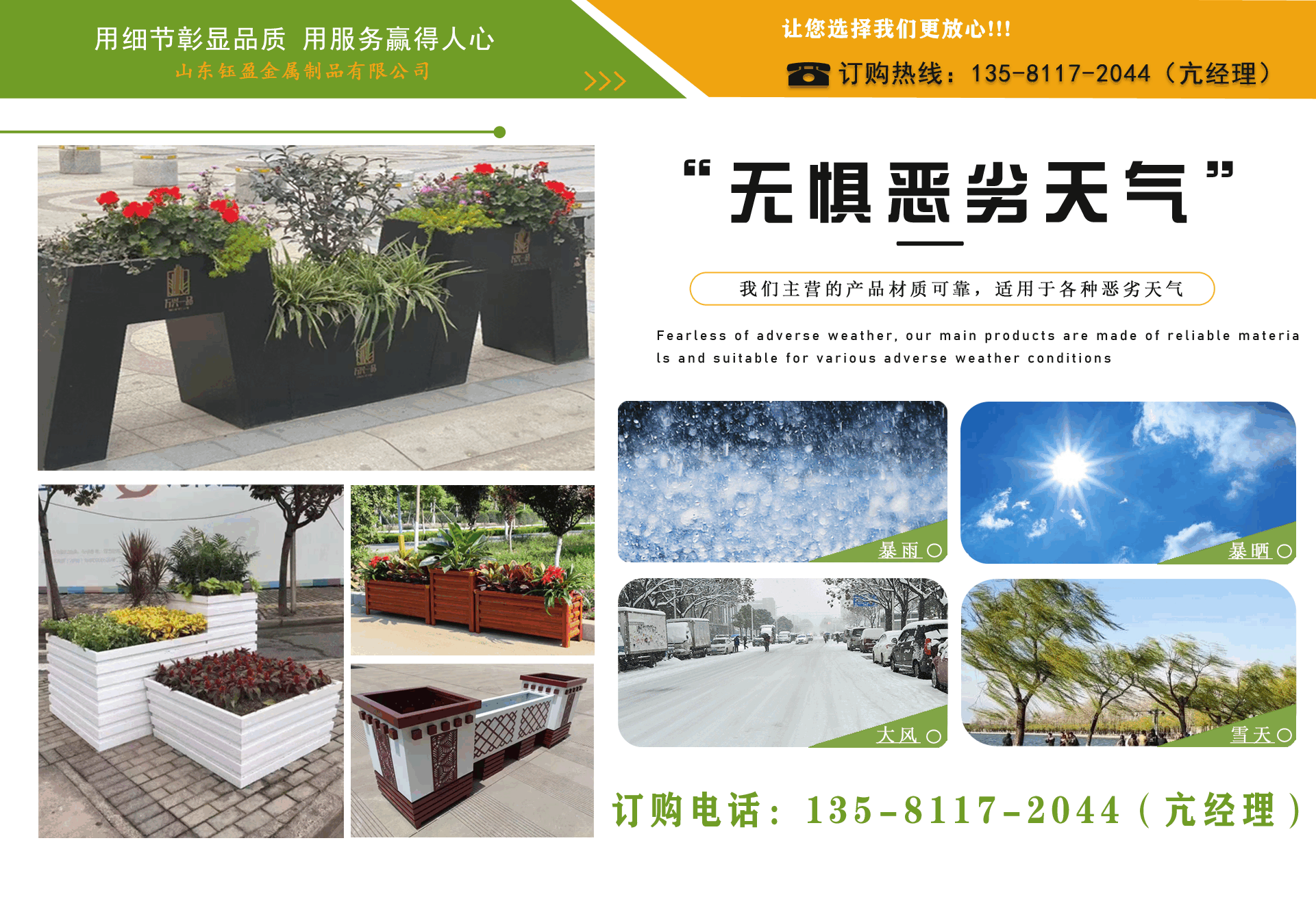 山東鈺盈金屬制品有限公司主營鍍鋅板花箱,道路隔斷花箱,定制花箱,戶外道路花箱,花箱座椅等產品,產品結構合理、性能優(yōu)良,具有強度高、耐腐蝕、抗老化、隔熱隔音、節(jié)約能源、外形美觀、使用壽命長等優(yōu)點,深受國內外客戶認可。 我們根據(jù)客戶所在城市的文化特征,制造出符合當?shù)爻鞘形幕瘹庀⒌淖匀涣Ⅲw、觀賞性強的花箱產品成為城市里一道靚麗的風景線。 公司實行誠實、公正、守信、價格合理、平等互利。 公司憑借雄厚經驗實力,恪守誠信為本的原則,得到了眾多客戶的信賴,并在業(yè)界獲得良好的口碑。建立了穩(wěn)固的合作關系,隨著業(yè)務的不斷發(fā)展和壯大,合作伙伴的范圍也在不斷擴大。我們熱情盼望與您的合作,為社會的可持續(xù)發(fā)展獻上一份努力。...